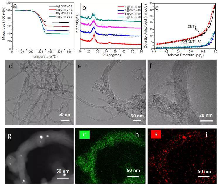 圖1 樣品的結(jié)構(gòu)表征。不同硫碳復合材料的(a)TG和(b)XRD圖譜。(c)S@CNTs-50和CNTs的氮氣吸脫附曲線,(d)CNTs 的TEM照片,(e,f)S@CNTs-50 的TEM照片,和(g-h)S@CNTs-50的TEM mapping。