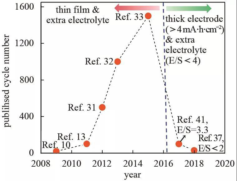 隨著厚硫電極和低E/S比例的鋰硫電池研究工作的出現(xiàn),文獻(xiàn)報(bào)道的鋰硫電池的循環(huán)圈數(shù)大大下降(圖3)。這與實(shí)際條件下硫正極和金屬鋰的持續(xù)可逆反應(yīng)還存在很多亟待克服的困難相關(guān),例如硫利用率低、鋰枝晶和“死鋰”、體積膨脹等。軟包鋰硫電池可更加精確地控制硫電極的面載量、電極孔隙率、電解液用量和分布等。因此,軟包鋰硫電池為揭示鋰硫電池在實(shí)際條件下循環(huán)衰退的原因、探索改進(jìn)鋰硫電池循環(huán)壽命的方法提供了一種切近實(shí)際的研究方法。