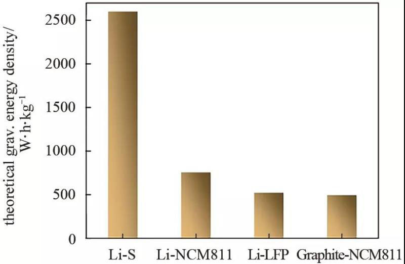 鋰硫電池是一種以高比容量硫(1675 mA·h/g)作為正極材料、高容量的金屬鋰(3860 mA·h/g)作為負(fù)極材料的電池體系,基于2Li+SLi2S的可逆反應(yīng),平均放電電壓約為2.15 V,理論能量密度高達(dá)2500 W·h/kg,是目前商業(yè)化鋰離子電池能量密度理論值的3~8倍。鋰硫電池具有能量密度高、不含貴金屬(Co、Ni等)且成本低的優(yōu)勢(shì),因此引起了學(xué)術(shù)界和產(chǎn)業(yè)界的廣泛關(guān)注,是一種有潛力的新型高能量電池體系(圖1)。