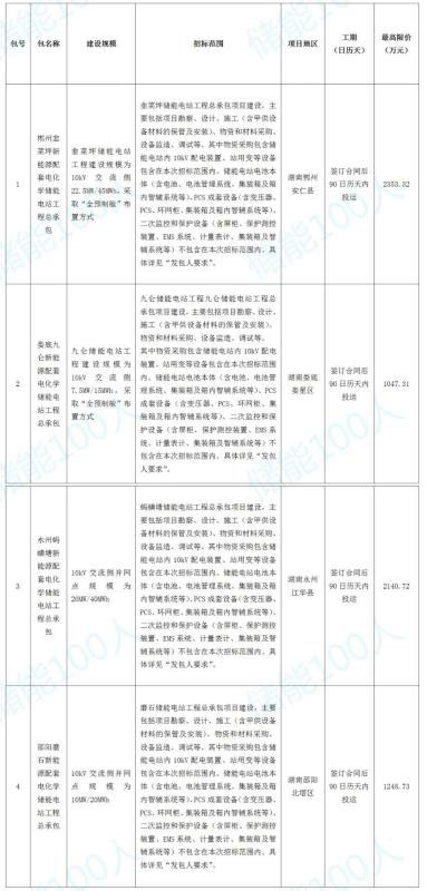 “儲(chǔ)能100人”獲取的招標(biāo)文件顯示,本次項(xiàng)目EPC招標(biāo)分為四個(gè)標(biāo)包分別招標(biāo),其中郴州韭菜坪規(guī)劃建設(shè)22.5MW/45MWh、婁底九侖7.5MW/15MWh、永州螞蟥塘20MW/40MWh、邵陽(yáng)磨石10MW/20MWh,四地合計(jì)60MW/120MWh,與湖南電網(wǎng)側(cè)儲(chǔ)能一期規(guī)模相同。