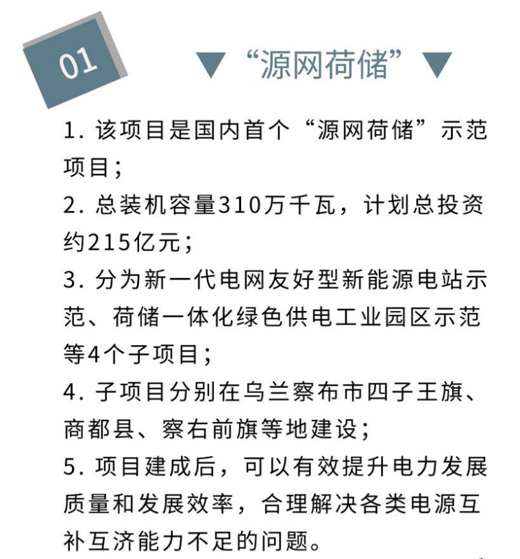 “源網(wǎng)荷儲(chǔ)”項(xiàng)目是一種包含“電源、電網(wǎng)、負(fù)荷、儲(chǔ)能”整體解決方案的運(yùn)營(yíng)模式,可精確控制用電負(fù)荷和儲(chǔ)能資源,解決清潔能源消納及其產(chǎn)生的電網(wǎng)波動(dòng)性等問(wèn)題。對(duì)于烏蘭察布市就地消納清潔能源、解決地區(qū)缺電問(wèn)題、促進(jìn)與電網(wǎng)友好協(xié)同發(fā)展具有重要意義。