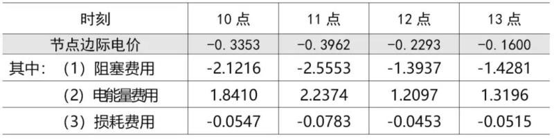 美國電力市場普遍采取節(jié)點邊際電價,該價格反映某個節(jié)點上增加單位負荷需求時的邊際成本,其數(shù)值受供需情況和電網(wǎng)阻塞影響。當系統(tǒng)整體供大于求或電網(wǎng)發(fā)生阻塞導致局部供需失衡時,可能產(chǎn)生節(jié)點邊際電價為負的情況。例如,4月26日上午10:00至下午13:00,加州某節(jié)點的節(jié)點邊際電價為負值(見表1)。