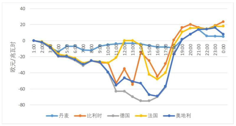 歐洲電力市場采取分區(qū)邊際電價機制,即根據(jù)電網(wǎng)阻塞情況事先劃定若干分區(qū),分別根據(jù)分區(qū)內(nèi)的機組和負荷報價,計算分區(qū)邊際價格。近年來,受新能源快速發(fā)展、需求下降等影響,電力呈現(xiàn)供大于求格局。為進一步豐富供需調(diào)節(jié)手段,德國、法國、奧地利和瑞士等國家先后引入了負電價制度。部分新能源機組為獲取新能源發(fā)電補貼在市場中采取報負價的競爭策略,德國、法國、丹麥、比利時等國的負電價現(xiàn)象頻發(fā)。其中,德國在一季度已有128小時處于負電價狀態(tài)。4月以來,由于新能源大發(fā)等因素,德國等國家負電價幅值進一步增加,5月24日德國電價最低跌至近-80歐元/兆瓦時(如圖2所示)。