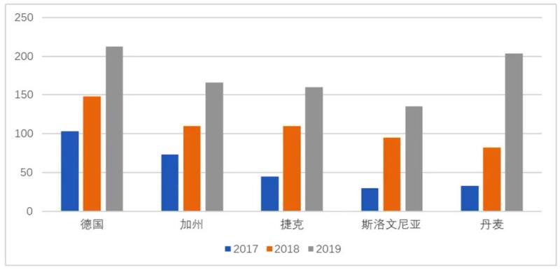 圖1 2017-2019年部分國家和地區(qū)負電價小時數(shù)