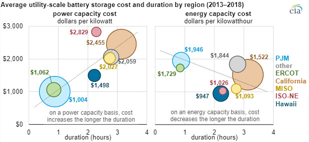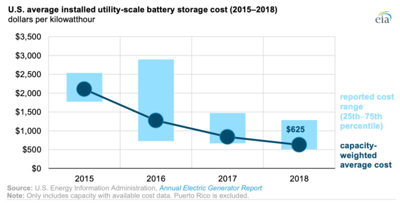 中國儲能網(wǎng)訊:根據(jù)美國能源信息署的數(shù)據(jù),美國公用事業(yè)規(guī)模電池存儲的平均能量容量成本已從2015年的2152美元/千瓦時迅速降至2018年的625美元/千瓦時。截至2018年底,美國的電池裝機功率容量為869兆瓦(電池在給定時刻所能提供的最大功率),電池能量容量為1236兆瓦時(電池可儲存的總能量)。