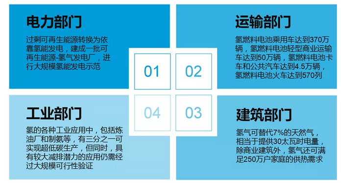 2019年2月,歐洲燃料電池和氫能聯(lián)合組織結(jié)合17家活躍于氫和燃料電池技術(shù)領(lǐng)域的企業(yè)的信息和數(shù)據(jù),制定并發(fā)布《歐洲氫能路線圖:歐洲能源轉(zhuǎn)型的可持續(xù)發(fā)展路徑》。報(bào)告提出歐洲發(fā)展氫能的路線圖,明確到2030年歐洲在氫能發(fā)電、氫燃料電池汽車、家庭和建筑物用氫、工業(yè)制氫用氫等方面的具體目標(biāo)(見圖5)。