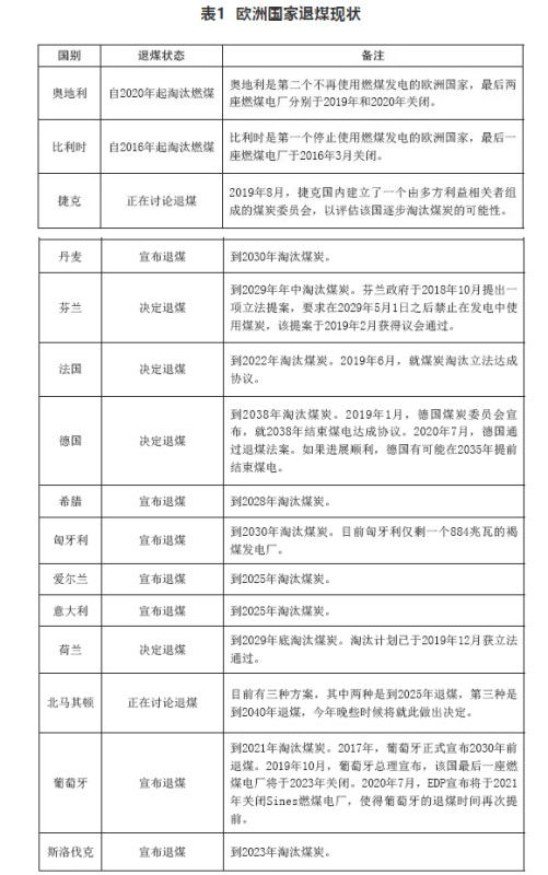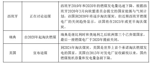 為了落實(shí)《巴黎協(xié)定》中的溫室氣體減排目標(biāo),歐洲各國政府陸續(xù)公布了淘汰煤炭的時(shí)間表(見表1)。第一個(gè)結(jié)束燃煤使用歷史的歐洲國家為比利時(shí),該國于2016年停止使用煤炭。2020年,奧地利和瑞典相繼關(guān)停各自國內(nèi)最后一座燃煤電廠,正式結(jié)束燃煤發(fā)電歷史。