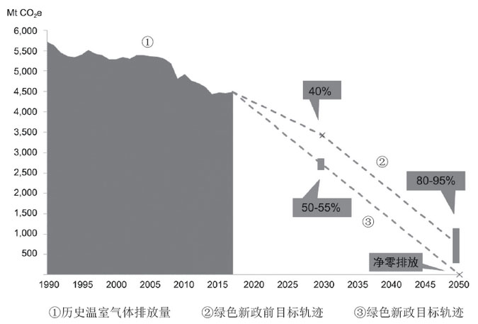 2019年12月,歐盟委員會(huì)正式發(fā)布《歐洲綠色協(xié)議》(簡稱“綠色新政”),闡明歐洲邁向氣候中性循環(huán)經(jīng)濟(jì)體的行動(dòng)路線,提出提高歐盟2030和2050年氣候目標(biāo),即2030年溫室氣體排放量在1990年基礎(chǔ)上減少50%~55%,2050年實(shí)現(xiàn)凈零排放的碳中和目標(biāo)(見圖1)。