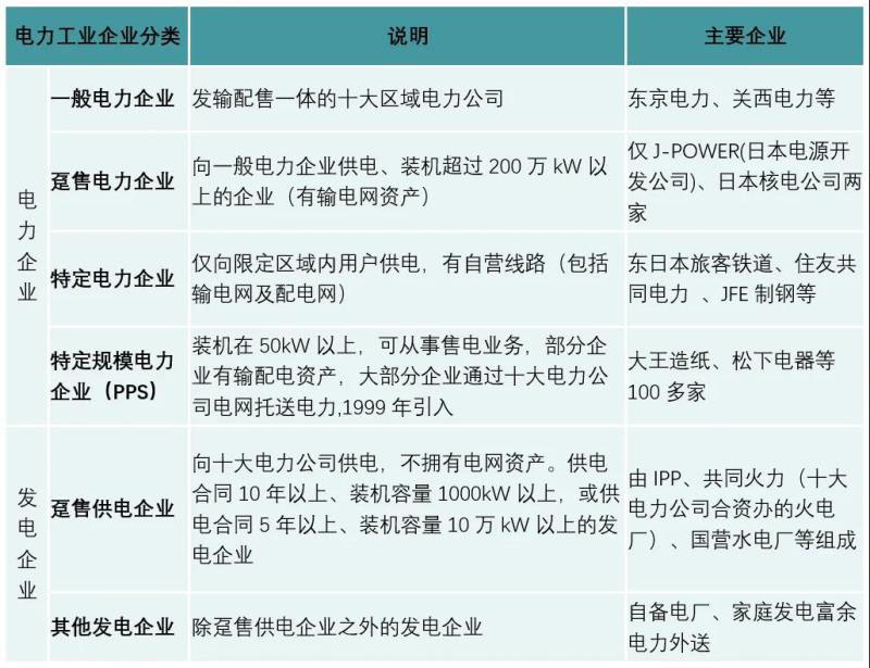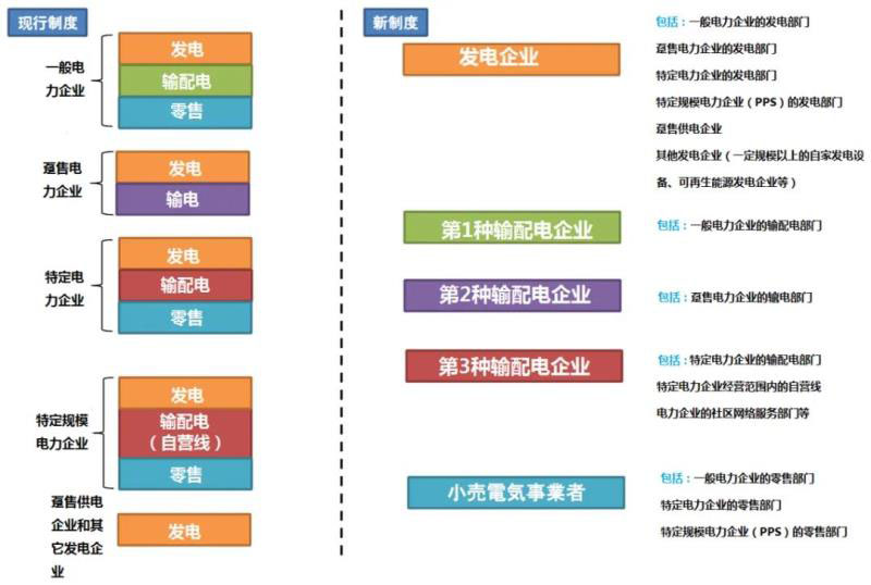 改革前日本的電力工業(yè)結(jié)構(gòu)(如表2所示)中電力企業(yè)分為一般電力企業(yè)(十大電力公司)、躉售電力企業(yè)(包括日本電源開發(fā)公司和日本核電公司兩家)、特定電力企業(yè)(為特定區(qū)域用戶供電),特定規(guī)模電力企業(yè)(PPS)、躉售供電企業(yè)。為全面放開用戶選擇權(quán),新法案對這些企業(yè)進行了重新劃分。分為發(fā)電企業(yè)、輸配電企業(yè)(分為三類)和售電企業(yè),并規(guī)定了相應的權(quán)力和義務。