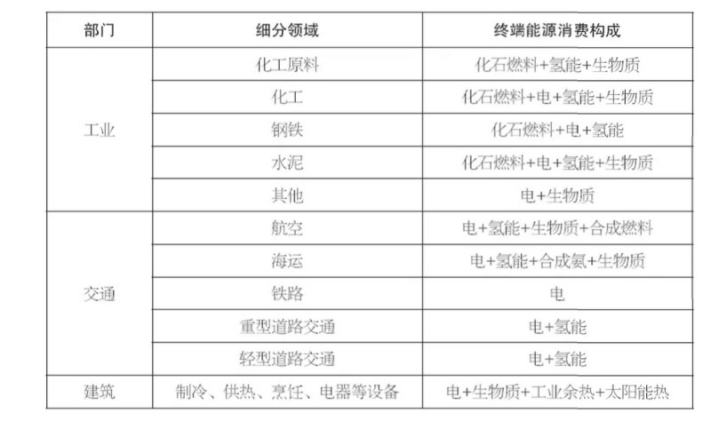 2.交通部門。為了實(shí)現(xiàn)我國交通部門的碳中和,需要將路面運(yùn)輸(公路和鐵路服務(wù))全面電氣化,同時(shí)長途航空和船運(yùn)改用零碳燃料(氫氣、氨等)。1)路面交通。目前,我國高鐵已基本實(shí)現(xiàn)了全面電氣化,普通速度的鐵路交通在未來也將逐步實(shí)現(xiàn)全面電氣化。純電動(dòng)汽車將在未來主導(dǎo)中短距離的交通出行,而氫燃料電池汽車則會(huì)在長距離貨運(yùn)卡車和重型卡車中占據(jù)主要地位。2)航空和海運(yùn)。針對(duì)航空海運(yùn)領(lǐng)域,直接應(yīng)用電氣化實(shí)現(xiàn)碳中和的空間較小,因此,航空和海運(yùn)交通的脫碳則必須主要依靠零碳的新型燃料。對(duì)于航空領(lǐng)域,依靠生物航空燃油和合成航空燃油是實(shí)現(xiàn)碳中和的主要技術(shù)路徑。此外,未來需要使用生物燃料和氨對(duì)船運(yùn)領(lǐng)域進(jìn)行深度脫碳。綜上,零碳電能、氫能、航空燃油、生物燃料和氨等多種綜合能源的使用將會(huì)進(jìn)一步加速我國碳中和目標(biāo)的實(shí)現(xiàn)。