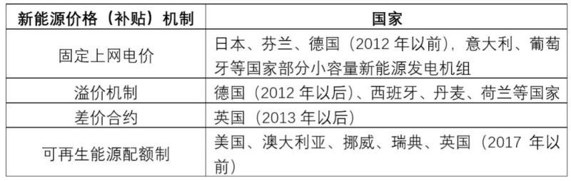日本、芬蘭等國(guó)家實(shí)施固定上網(wǎng)電價(jià)機(jī)制,德國(guó)、意大利、葡萄牙等國(guó)通常只對(duì)容量較小的新能源發(fā)電機(jī)組實(shí)施。