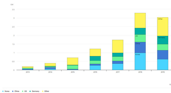 韓國的年裝機容量在2018年創(chuàng)下紀錄后下降了80%,當時韓國占全球儲能裝機容量的三分之一。下降的原因是人們越來越擔心2018年電網(wǎng)規(guī)模的儲能工廠發(fā)生的幾起火災。盡管對火災和安全措施進行了大規(guī)模審查,但2019年又發(fā)生了5起火災。