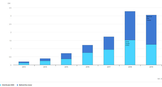 2019年,全球電力系統(tǒng)新增了2.9 GW的儲能容量,比2018年減少了近30%。這一趨勢背后的因素表明,儲能技術(shù)在很大程度上仍處于早期階段,目前只存在于少數(shù)幾個關(guān)鍵市場,嚴重依賴政策支持。