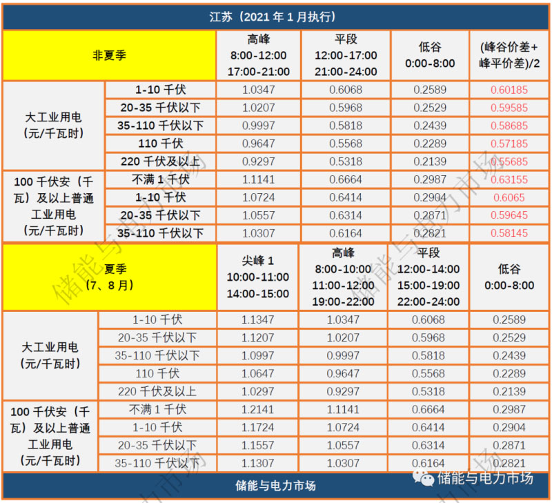 2020年11月3日,江蘇省發(fā)改委發(fā)布了《關(guān)于江蘇電網(wǎng)2020-2022年輸配電價(jià)和銷售電價(jià)有關(guān)事項(xiàng)的通知》。根據(jù)通知的內(nèi)容,江蘇省峰谷價(jià)差最大為0.8154,最低為0.7158(如下表)。