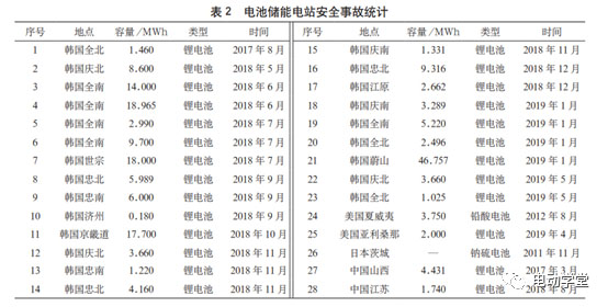 由表2可知,從火災(zāi)地點(diǎn)來看,電池儲(chǔ)能電站火災(zāi)事故主要集中在韓國,而美國、日本和中國也均已發(fā)生電站火災(zāi)事故。從儲(chǔ)能類型來看,電池儲(chǔ)能技術(shù)類型主要為鋰電池。這一方面是由于鋰電池在各類型電池中裝機(jī)容量占比最大;另一方面,是因?yàn)殇囯姵貎?nèi)部存在較多放熱反應(yīng),在一定條件下易發(fā)生熱失控。