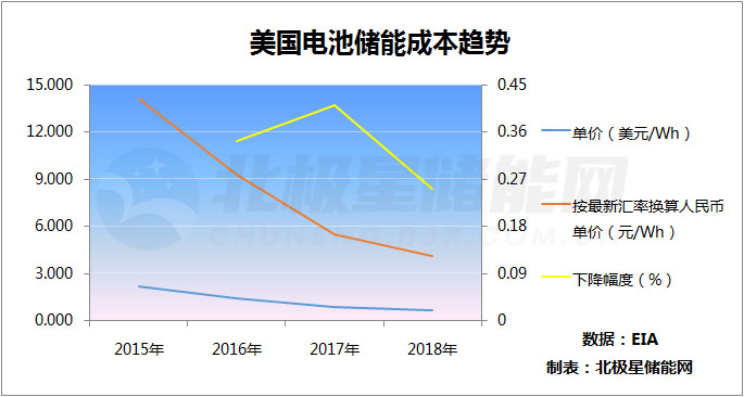美國能源署的數(shù)據(jù)顯示,美國的電池儲(chǔ)能成本從2015年的2.153美元/Wh降到2018年0.625美元/Wh,三年儲(chǔ)能成本降幅超70%。2018年還曾有國外調(diào)研機(jī)構(gòu)預(yù)估,到2022年電池儲(chǔ)能系統(tǒng)價(jià)格將以每年8%的速度下降。