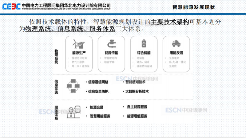 接下來(lái)我們來(lái)看智慧能源規(guī)劃設(shè)計(jì)的主要技術(shù)架構(gòu),分為三個(gè)部分:物理系統(tǒng)、信息系統(tǒng)、服務(wù)體系。