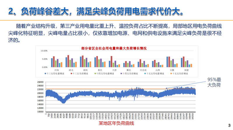 2、從電力系統(tǒng)建設(shè)和運營經(jīng)濟(jì)性的角度,未來負(fù)荷中心的峰谷差呈現(xiàn)逐漸增大的趨勢,通過下面的柱狀圖看到無論是十三五還是十四五、十五五的預(yù)測當(dāng)中,負(fù)荷的增速都是大于用電量的增速,負(fù)荷特性尖峰化的特征越來越明顯,尖峰電量占比很少,對于這部分尖峰負(fù)荷的供電,僅僅依靠增加電源、電網(wǎng)和供電設(shè)施來滿足對電網(wǎng)的建設(shè)還是很不經(jīng)濟(jì)的。下面是某負(fù)荷中心的年負(fù)荷曲線,如果按95%最大負(fù)荷劃線的話超過95%的負(fù)荷是很少的。