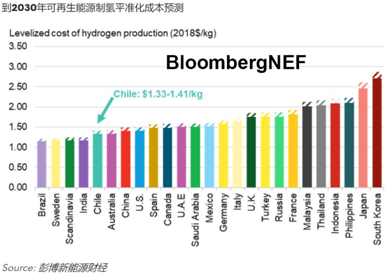 智利在11月3日和4日舉行的綠色氫氣線上峰會(huì)上宣布了國(guó)家氫能發(fā)展戰(zhàn)略,提出了未來(lái)10年成為綠氫主要出口國(guó)的大膽計(jì)劃。優(yōu)越的可再生資源加上電解槽部署規(guī)??焖贁U(kuò)張,智利有機(jī)會(huì)成為全球綠氫制備成本最低的國(guó)家之一。然而,財(cái)政支持不足不利于實(shí)現(xiàn)氫能產(chǎn)業(yè)迅速擴(kuò)大規(guī)模的目標(biāo)。