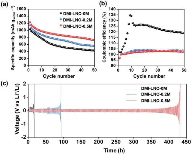 2) 作者使用0.5 M LiNO3作為添加劑來穩(wěn)定鋰負極,以提升鋰硫電池循環(huán)性能;