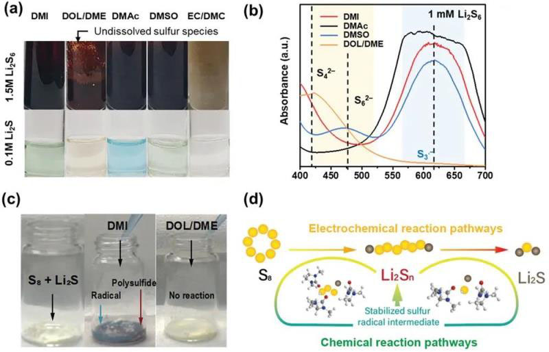 1) 首次提出以1,3-二甲基-2-咪唑啉酮(DMI)為鋰硫電池溶劑。DMI對多硫化鋰溶解度高,且二者不發(fā)生反應;