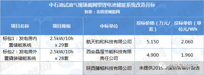 試油氣現(xiàn)場(chǎng)離網(wǎng)型鋰電池儲(chǔ)能系統(tǒng)改造項(xiàng)目共分兩個(gè)標(biāo)包,分別需采購2.5kW/25kWh儲(chǔ)能系統(tǒng)29套和28套,最高限價(jià)分別為156.6萬元和159.6萬元。結(jié)果顯示航天鈞和科技有限公司和西安晶屋節(jié)能科技有限責(zé)任公司獲得中標(biāo),兩者投標(biāo)單價(jià)約2.06元/Wh和1.96元/Wh。