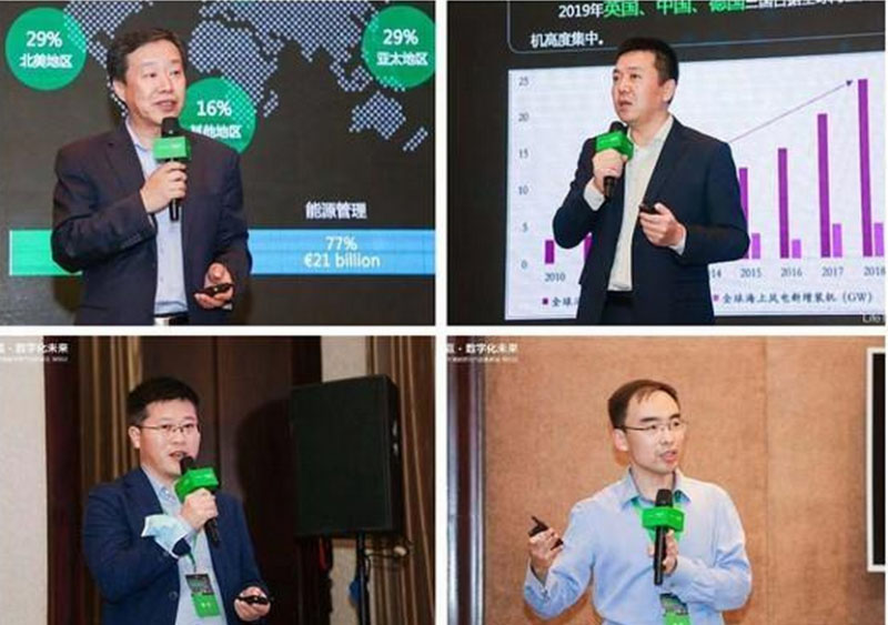 嘉賓演講 (左上:施耐德電氣中國區(qū)副總裁李繼敏,左下:中國化學(xué)與物理電源行業(yè)協(xié)會儲能應(yīng)用分會秘書長劉勇,右上:施耐德電氣能效管理低壓業(yè)務(wù),行業(yè)市場及應(yīng)用部門負責人趙天意,右下:北京鑒衡認證中心風(fēng)能事業(yè)部總經(jīng)理張宇)