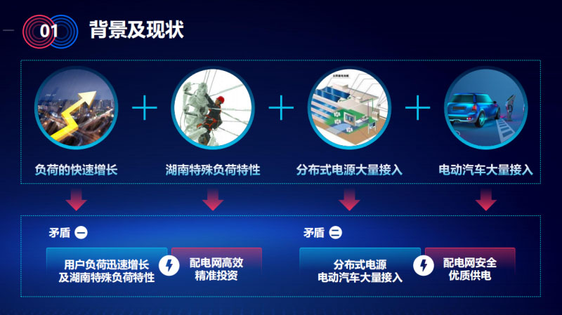 隨著國家配電網(wǎng)建設(shè)改造行動(dòng)計(jì)劃和湖南點(diǎn)三年行動(dòng)計(jì)劃一系列措施落地,湖南配電網(wǎng)的建設(shè)取得了長遠(yuǎn)的發(fā)展進(jìn)步。2015到2020年戶均配電容量1.41上升到2.08,農(nóng)村電網(wǎng)1.09上升到1.71,供電可考慮99.71上升到99.83,配電網(wǎng)的建設(shè)取得了長足的進(jìn)步。同時(shí)看出來,隨著負(fù)荷的快速增長,以及分布式電源、電動(dòng)汽車的大量接入,配電網(wǎng)業(yè)面臨很多困難。作為電網(wǎng)公司有兩大方面的主要矛盾: