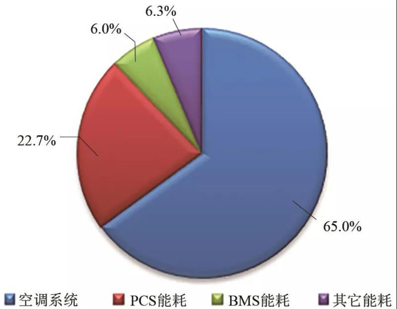 本文以鋰離子電池集裝箱儲能系統(tǒng)為研究對象,通過對實(shí)測能耗數(shù)據(jù)進(jìn)行分析得出,集裝箱儲能系統(tǒng)運(yùn)行能耗主要包含:空調(diào)系統(tǒng)能耗、PCS能耗、BMS能耗、輔助系統(tǒng)能耗。其中空調(diào)系統(tǒng)能耗與選型設(shè)計(jì)、運(yùn)行策略和風(fēng)道設(shè)計(jì)等相關(guān),系統(tǒng)設(shè)備能耗多與器件選型和電路設(shè)計(jì)有關(guān)。根據(jù)以上數(shù)據(jù)分析,針對集裝箱不同系統(tǒng)和設(shè)備進(jìn)行降能耗方案的研究,從而提高儲能設(shè)備電力效率。