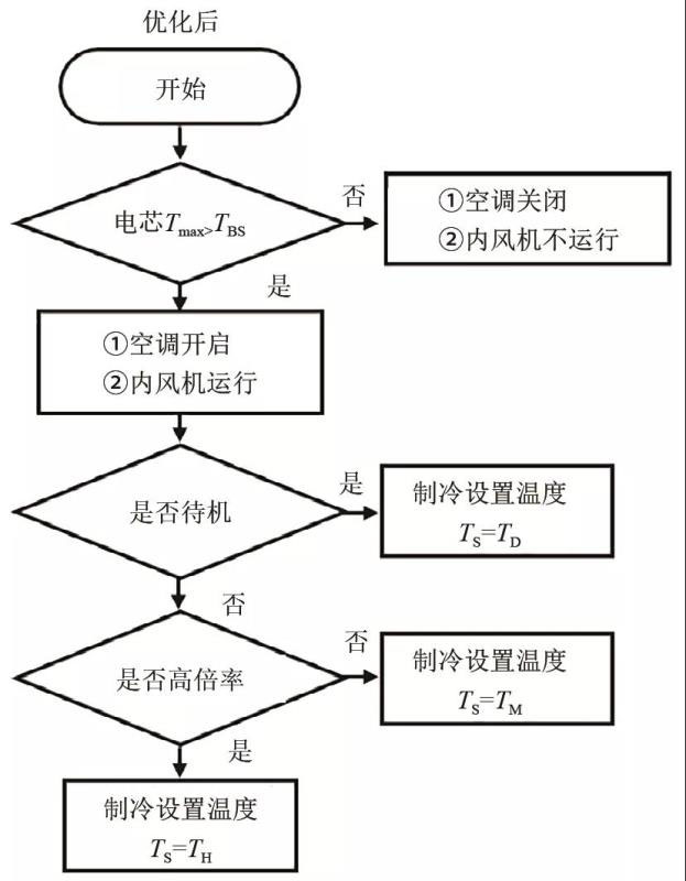 如圖8所示,集裝箱儲能系統(tǒng)優(yōu)化前溫度控制策略中,空調(diào)溫度設(shè)定為Ts,為了保證系統(tǒng)正常充放電運(yùn)行,Ts設(shè)定值較低,以滿足整個(gè)運(yùn)行過程中溫度要求。但該方案導(dǎo)致系統(tǒng)待機(jī)和低倍率運(yùn)行時(shí):漏熱量增加、空調(diào)平均COP值增加、內(nèi)風(fēng)機(jī)運(yùn)行時(shí)間長。