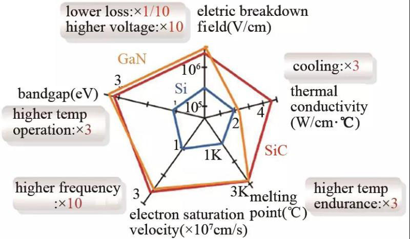 Si基電力電子器件的發(fā)展已經(jīng)達(dá)到Si材料的物料理論極限,為了發(fā)展更高性能的電力電子器件,當(dāng)前國際上普遍采用碳化硅(SiC)和氮化鎵(GaN)為代表的第三代寬禁半導(dǎo)體材料電力電子器件。相比于傳統(tǒng)Si基電力電子器件,第三代半導(dǎo)體器件具有禁帶寬、擊穿電場強(qiáng)度高、載流子飽和漂移速度高、導(dǎo)熱率高等優(yōu)異的物料特性。