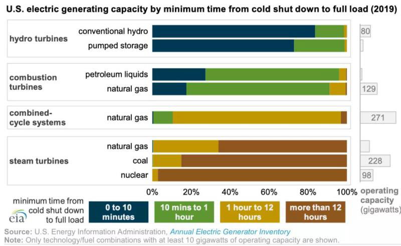 大多數(shù)水力渦輪機使用流動的水來旋轉(zhuǎn)渦輪機,從冷啟動到完全運行不到10分鐘(占美國電力裝機的11%)。燃燒式渦輪機,使用燃燒的燃料空氣混合物來旋轉(zhuǎn)渦輪機,啟動速度也相對較快(1小時之內(nèi),占美國電力裝機14%)。蒸汽輪機通常需要更多的時間,因為燃料加熱水形成蒸汽,蒸汽需要達到一定的溫度、壓力和含水量閾值,然后才能被引導到渦輪機上,從而使發(fā)電機旋轉(zhuǎn)。