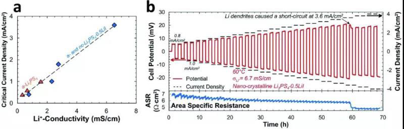 圖16 (a)鋰枝晶生長起始點和鋰離子電導率之間的關(guān)系;(b)臨界電流密度測試。