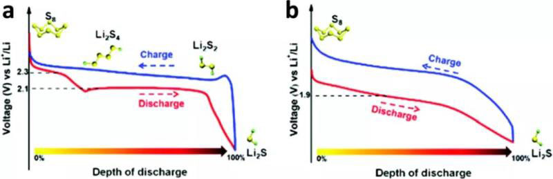 圖2 (a)典型結(jié)構(gòu)和(b)鋰-硫電池的充放電曲線。