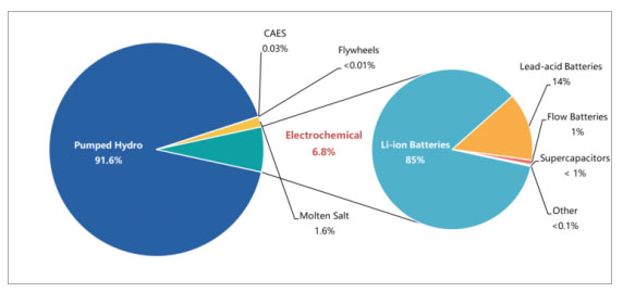 但是,抽水蓄能的市場份額正在穩(wěn)步下降,而電池儲能系統(tǒng)的份額卻在逐步上升。研究發(fā)現(xiàn),中國部署的鋰離子電池儲能系統(tǒng)占到所有電池儲能系統(tǒng)裝機容量的85%,而在全球范圍內,這一數(shù)字甚至更高,達到90%。