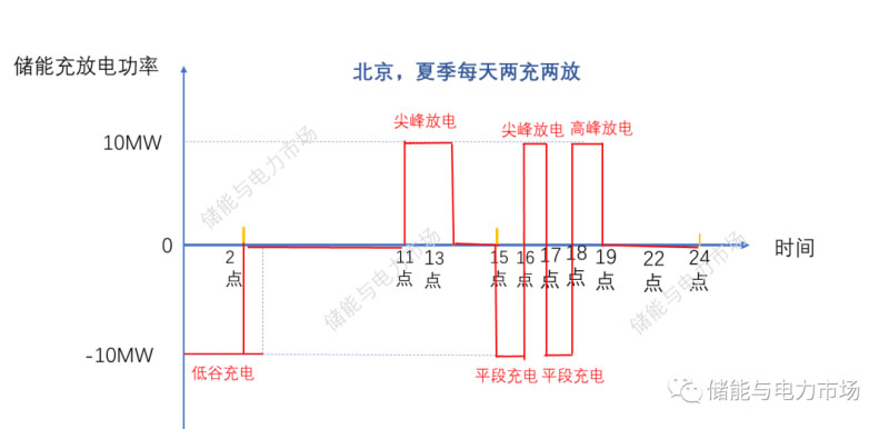 夏季,每天低谷0-2點,平段15-16點,17-18點充電,總共充電4小時,每天高峰18-19點,以及尖峰11-13點、16-17點放電,總計放電4小時。