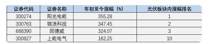 從資本市場(chǎng)來看,光伏設(shè)備指數(shù)年內(nèi)熱度較高,年初至今漲幅達(dá)到122.05%,在申萬三級(jí)分類指數(shù)中排名第二。值得注意的是,在光伏板塊中與龍頭組件、光伏輔材廠商相比,光伏逆變器主要廠商近期的關(guān)注度相對(duì)較低,但其年內(nèi)漲幅卻在板塊內(nèi)遙遙領(lǐng)先,具體情況如下: