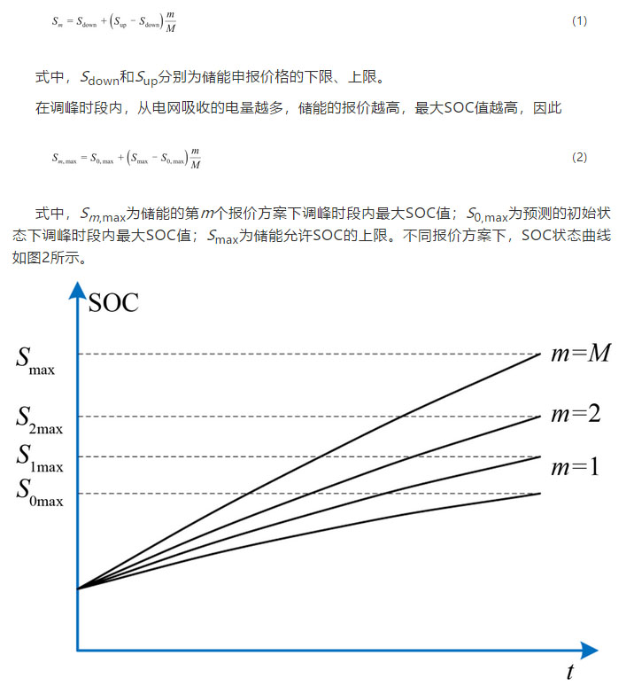 根據(jù)青海、甘肅已發(fā)布的電儲能交易規(guī)則,在風電場、光伏電站計量出口內建設的電儲能設施,其充電能力優(yōu)先由所在風電場和光伏電站使用,由電儲能設施投資運營方與風電場、光伏電站協(xié)商確定補償費用。儲能(特指新能源發(fā)電側電能,下同)在獨立參與調峰市場前,需要基于所配套的風電場或光伏電站次日的發(fā)電出力計劃,預測儲能次日的充放電行為,獲得其荷電狀態(tài)(state of charge,SOC)預測值,進而決策其參與調峰市場的報價行為。儲能獨立參與市場獨立承擔收益及損耗成本。