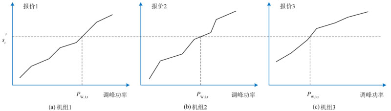 式中,CV為電網(wǎng)調峰成本;TV為系統(tǒng)需要調峰的時段;Ni和Nj分別為參與調峰市場的儲能數(shù)量和火電機組數(shù)量;s?t為t時段調峰市場的邊際出清價格;PW,i,t、PW,j,t分別為t時段儲能和火電機組中標的調峰功率;Rt為t時段系統(tǒng)調峰需求。邊際出清價格與各市場成員的中標功率關系如圖3所示。