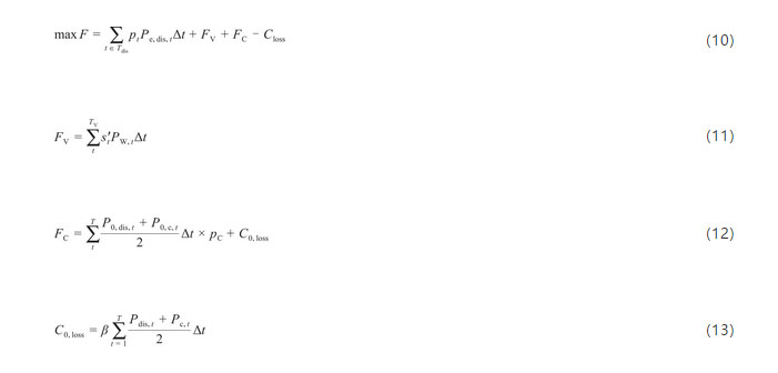 式中,Pt為t時段現(xiàn)貨市場的電價;Tdis為在調度周期內儲能放電的時段;Pe,dis,t為儲能在t時段參與現(xiàn)貨市場的放電功率;FC為新能源企業(yè)給予儲能的補償費用;pC為新能源的上網(wǎng)電價;FV為儲能參與調峰市場的實際收益;Closs為電池損耗費用;β為充/放電單位電能折合的電池損耗費用率;Pdis,t、Pc,t分別為儲能在t時段實際的放電功率和充電功率。