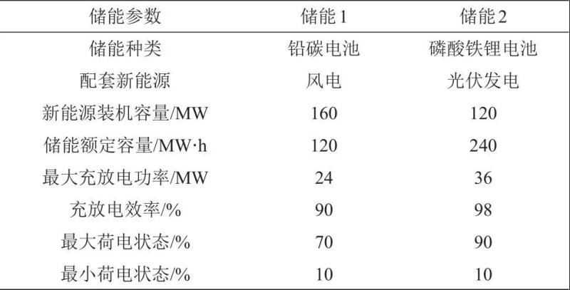 由于西北電網(wǎng)高比例新能源的特性,儲能參與調峰主要是指新能源大發(fā)時吸收系統(tǒng)電力。為了評估在西北區(qū)域儲能參與調峰市場對系統(tǒng)經(jīng)濟及自身效益的影響,對上述模型進行仿真分析。本文假設區(qū)域內有一個儲能配合風電場運行,一個儲能配合光伏電站運行,主要技術參數(shù)見表1。