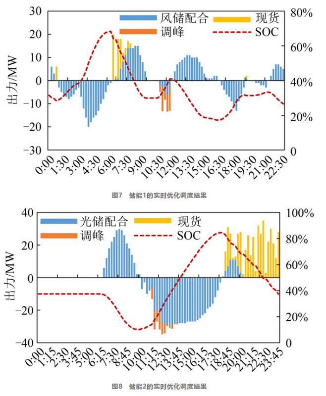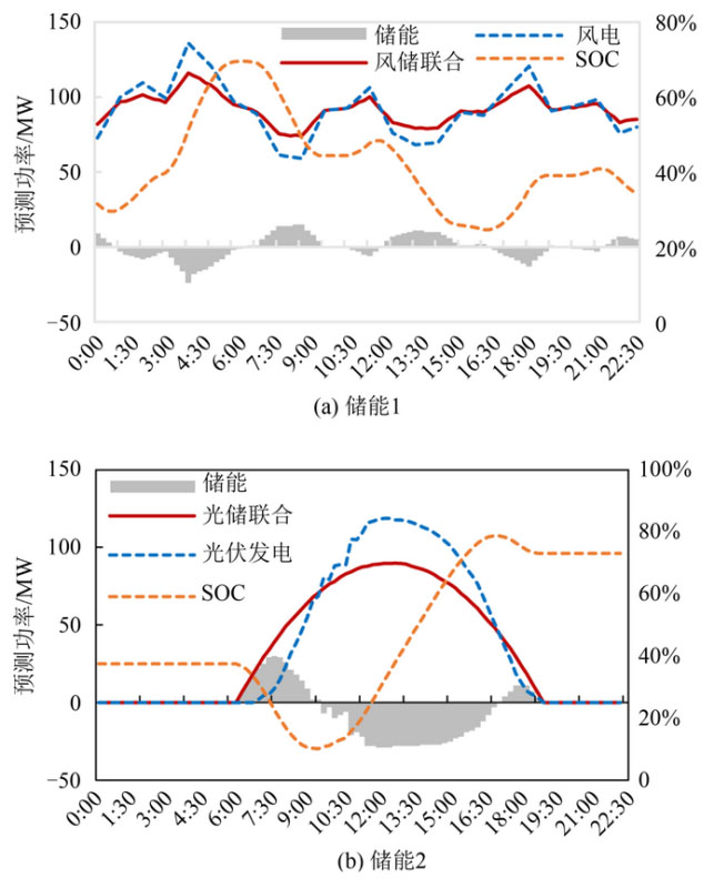 基于次日新能源的出力預測,得到儲能配合新能源電站運行的充放電行為預測結果如圖4所示,其中儲能功率大于0表示放電,小于0表示充電,SOC為對應時刻末的荷電狀態(tài)。儲能1和儲能2次日初始時刻(當日結束時刻)儲能容量分別為40 MW·h和90 MW·h。