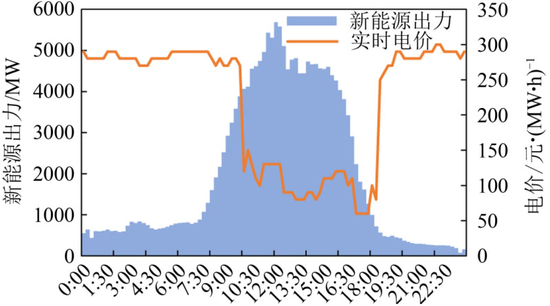 以西北區(qū)域某省級電網(wǎng)為例,預測該電網(wǎng)的96點新能源出力曲線和實時電價如圖5所示。