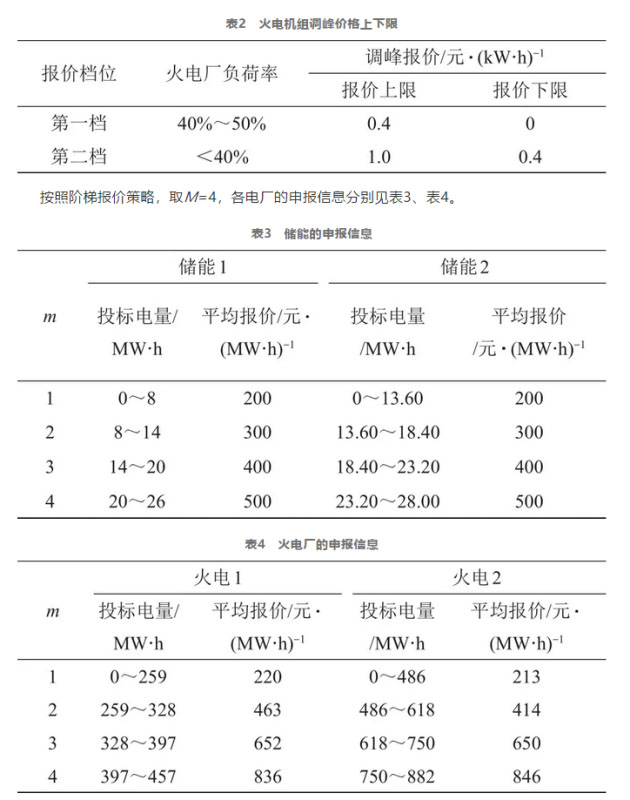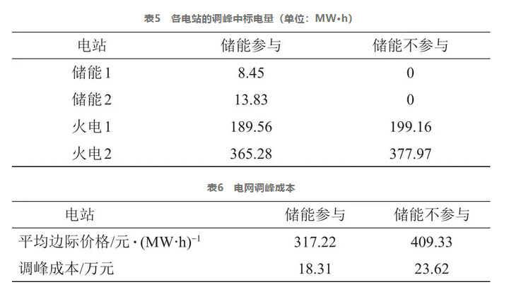 根據(jù)調峰市場的競價出清模型進行計算,表5、表6分別為儲能參與和不參與調峰市場時,調峰市場的競價出清結果以及電網(wǎng)的調峰成本。