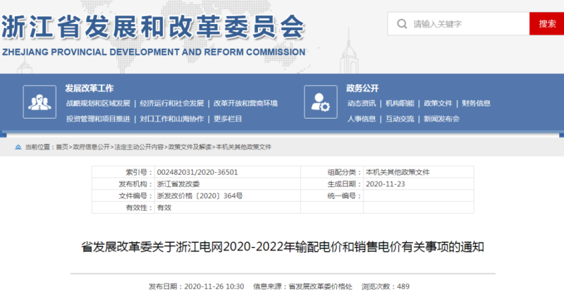 《關(guān)于浙江電網(wǎng)2020-2022年輸配電價(jià)和銷(xiāo)售電價(jià)有關(guān)事項(xiàng)的通知》
