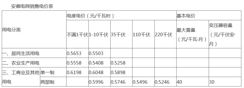 4、安徽省兩部制1-10千伏、35千伏、110千伏、220千伏目錄電價(jià)每千瓦時(shí)分別降低3.46分、4.46分、5.46分、6.96分。