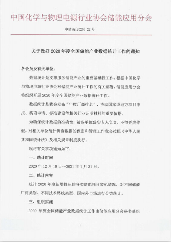 關于做好2020年度全國儲能產(chǎn)業(yè)數(shù)據(jù)統(tǒng)計工作的通知