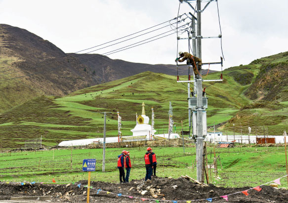 如今,在國網(wǎng)嘉興供電公司的幫扶下,無法長出樹木的凍土已立起銀色的鐵塔,它和遠處雄渾的雪山、白色的民居、綠色的草場和湛藍的天空一起,融入海拔4500米的景觀中。