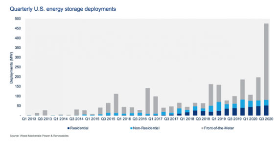 中國(guó)儲(chǔ)能網(wǎng)訊:根據(jù)調(diào)研機(jī)構(gòu)Wood Mackenzie公司和美國(guó)儲(chǔ)能協(xié)會(huì)(ESA)日前共同發(fā)布的調(diào)查報(bào)告,美國(guó)在2020年第三季度部署了476MW/764MWh電池儲(chǔ)能系統(tǒng),創(chuàng)下新的季度部署紀(jì)錄,與上一個(gè)季度紀(jì)錄相比增長(zhǎng)了240%。