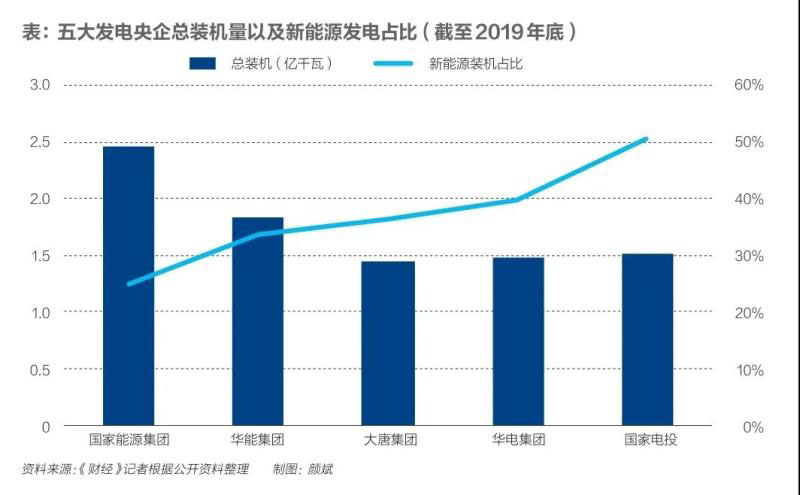 在五大發(fā)電集團里,可再生能源占比最高的國家電投集團的壓力就比國家能源集團小得多,該集團的火電裝機總量不到國家能源集團的一半,碳排放總量也不到后者的一半。截至2019年底,國家電投集團的可再生能源裝機占比已超過50%。